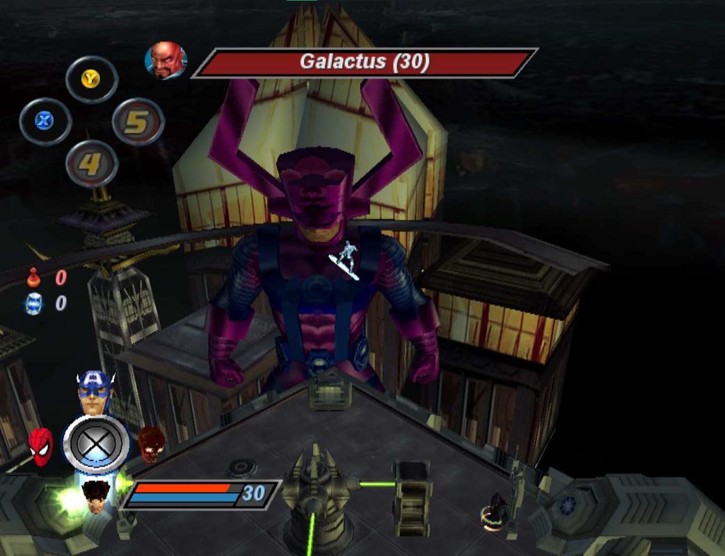 Но я разобрался какой комбинацией клавишей и после включения каких настроек можно в игре врубить режим призрака. Поэтому таким образом смог обойти тот триггер и короче битва с Галактусом изначально ВООБЩЕ какой-то странной планировалась. Сначала надо было забраться в здание и зафигачить кучу панишеров (похожий механизм с водными спавнерами, которые оффаются после уничтожения определенного количества врагов из них, использовали они позже на уровне Мандарина, то есть отсюда эту механику перекинули туда). После того, как все размочены и активирована консолька - телепортирует героев на другую арену, где уже бой с галактусом. И ээээ он типа просто стоит ничего не делает, но там три лазера и передвигаемая штука, которой можно эти лазеры заблокировать и потом позвать на помощь сёрфера. Причем!!!! Тут серфером прям можно управлять! То есть это не кте какое-то скучное, а прям ты реально берешь, летаешь им. У него две способности - лучи из рук и просто таран доской. По сути, это же потом попало и в финальную версию игры. Вот только играбельный сёрфер-то есть и в прототипе, но у него вообще нет способностей кроме полета. Забавно...
